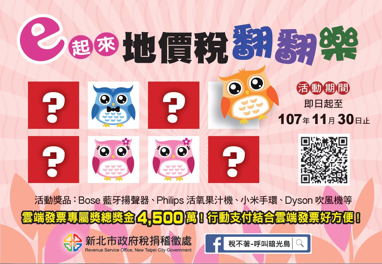 (2)幸運獎,中獎者需於開獎後7個工作日內私訊本處粉絲專頁「稅不著-呼叫暗光鳥」,註明參加「e起來地價稅翻翻樂」活動,填寫真實姓名、身分證字號、戶籍地址(需包含鄰里),本處將以雙掛號寄送至得獎者所提供之通訊地址,如所提供之地址不正確,郵寄經退回,將不再通知,也不再寄出。