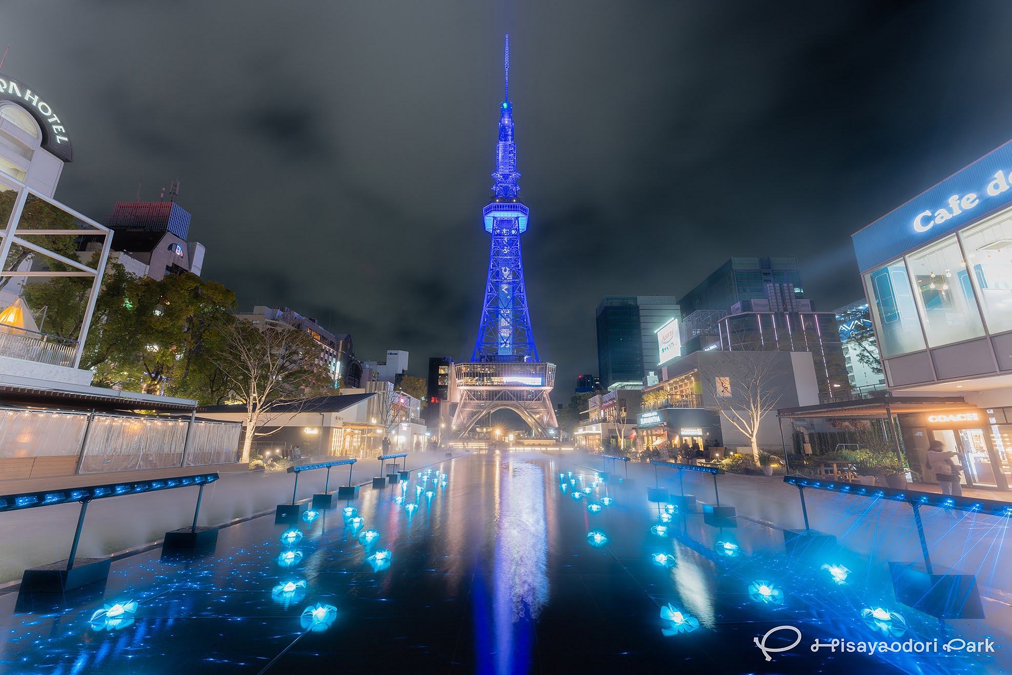 以縣花—燕子花的造型燈飾及藍色光束照亮水邊廣場的南區。燕子花有著「幸福將必造訪」的花語,富含了對於來到Hisaya-odori Park的大家的感謝之情,以及希望此地能成為一個充滿美好回憶的地點。