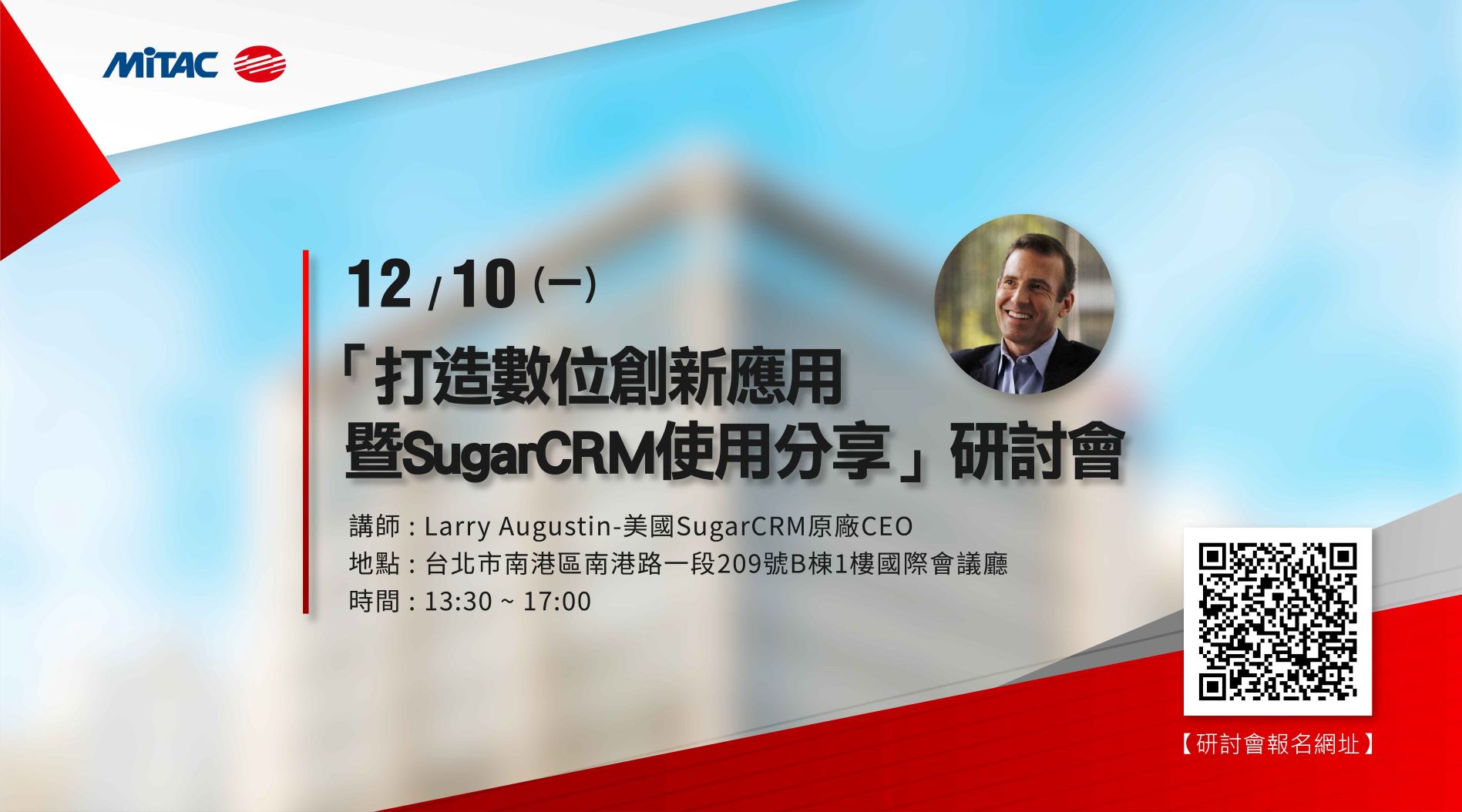 「打造數位創新應用暨SugarCRM使用分享」研討會,力邀各界數位科技專家,包含知名矽谷投資家賴里•奧古斯丁(Larry Augustin)博士、煙台台華食品蔣震武總經理、聯華氣體陳高明副總工程師、神達電腦陳欽專副總,分享關鍵趨勢與實際應用情境,期能激發更多的創意與想像力,加速產業升級與數位轉型,打造未來全方位數位經濟生態圈。