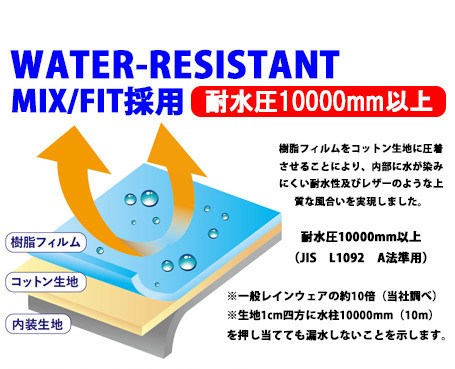 採用的防水布料是特製的PU加工帆布,耐水壓達10000mm以上,為一般雨衣的10倍,即使受到10米的水壓,水也不會漏水。啱晒打風都會排除萬難返工的各位。