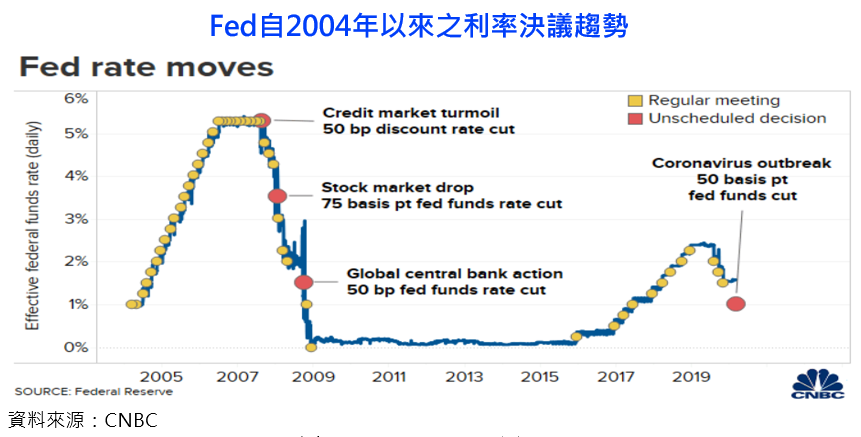 Fed於2020年3月3日發布聲明表示,由於新冠肺炎疫情對經濟活動造成不斷演進中的風險,因此聯邦公開市場操作委員會(FOMC)決議調降聯邦資金利率目標區間0.5個百分點至1.00%~1.25%,此次降息同時也是2008年金融海嘯以來的首次意外降息。
