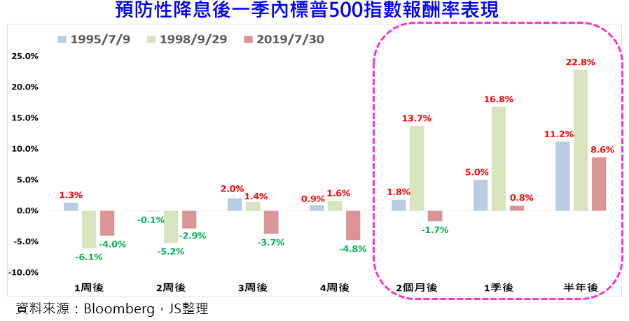 回顧Fed過去於1995/7/6、1998/9/29以及2019/7/31的三次預防性降息政策對美股的影響,可發現美股於預防性降息後的報酬走勢皆呈現倒吃甘蔗的轉強趨勢。