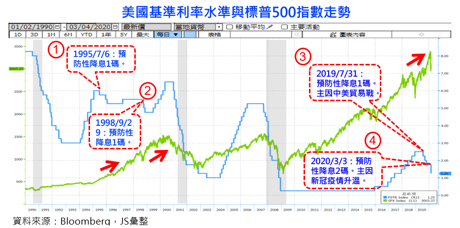 1.統計美國1990年以來至2019年為止,共出現3次預防性降息。