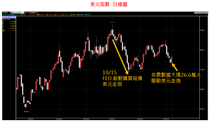 上週一(12/2)在差於預期的ISM經濟數據後,美元、美股持續走弱,ISM數據差於預期,原先預期為49.1,實際48.1,已連續四個月低於50榮枯線下,顯示 10 月的貿易談判所帶動的樂觀氣氛,並未改善美國製造業對未來景氣的看法,貿易戰仍令美國製造業疲弱,同時川普宣布將對巴西、阿根廷出口的鋼鋁加徵關稅,以上因素令美元反應明顯承壓,而弱勢僅持續到週五(12/6)非農公布當晚,在美國進入消費旺季使得臨時工需求提高下,本次非農原先預期18萬人,而實際公布為26.6萬人,大幅超越市場預期,數據公布後令美元、美股反彈,為上週的弱勢美元、與美股出現底部支撐。