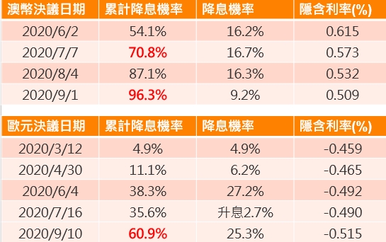 2020年開始至今,美元指數已經從去年底的96.389上漲2.83%之多,期間兩次非農皆優於市場預期,加上ISM製造業PMI從萎縮大幅反彈轉為擴張,都是美元漲勢不止的功臣;同時,本週以聯準會為首,將公布三個國家的利率決策會議記錄,其中市場對澳幣寬鬆預期最為強烈,從表中可以看到7月前降息至少一碼的機率已超過70%,年底前至少降息一碼機率更超95%;另一方面,歐元區縱使已落入負利率區域,雖然沒有這麼極端,市場也預期9月前降息機率達到6成之譜,導致澳幣與歐元雙雙跌至三年以來低點,也成為美元指數上漲原動力。