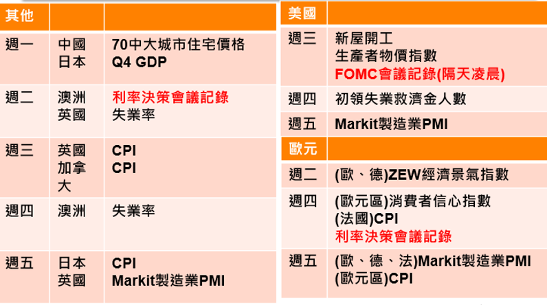 顯示美元與黃金雙飛格局仍有延續機會;最後本週除了前述利率決策會議記錄外,亦將公布多個國家CPI與Markit製造業PMI,市場將關注美國Markit製造業PMI是否能延續ISM製造業PMI氣勢進一步出現擴張跡象,另外也能直接比較各國數據;而CPI則是會影響市場對各國利率寬鬆預期,藉以評估美元是否持續強勢,因此數據公布時市場或生波動,交易機會將由此而生。