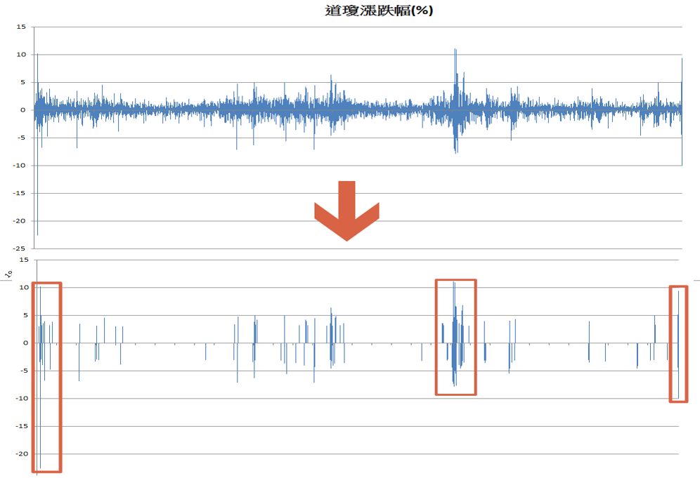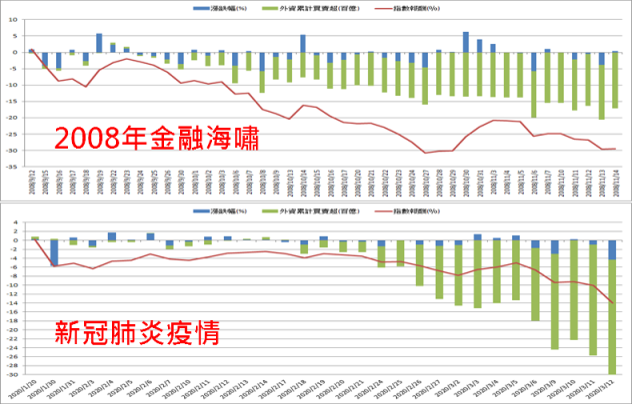 我們可從上面美股的波動圖來看,自1987年股災以來的每日漲跌統計,把3%以下漲跌幅拿掉後,可以清楚看到近年來重大事件時股市的脈絡,很明顯,每當有重大事件發生時,股市會呈現巨幅的上下波動,以修正合理的股價,而且波動越大時,則修正越快,2008年股市的漲跌幅相對較小,因而波動超過3%的交易日則持續了2個月之久,而且我們也能看到,目前道瓊的修才正剛開始而已。同樣的角度看台股,下圖藍色柱狀體為每日漲跌幅,搭配外資的累計買賣超(綠色部份),自有紀錄以來,外資的操作與台股走勢(紅線)息息相關不容置喙,看來短線如果要止跌,可能要看外資何時轉為買超了。