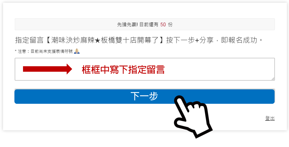 步驟2. 在【發燒網活動頁上】,寫下指定留言【潮味決炒麻辣★板橋雙十店開幕了】