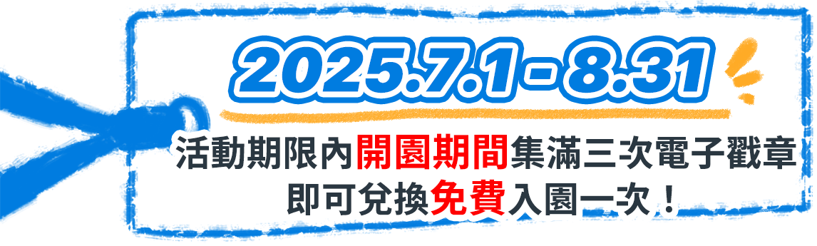 3. 活動方式:入園後,請前往遊客服務中心掃描蒐集電子戳章,每人/帳號集滿三次電子戳章,第四次入園即可兌換免費入園一次;第四次免費入園必須在114年9月30日前使用完畢,逾期失效。