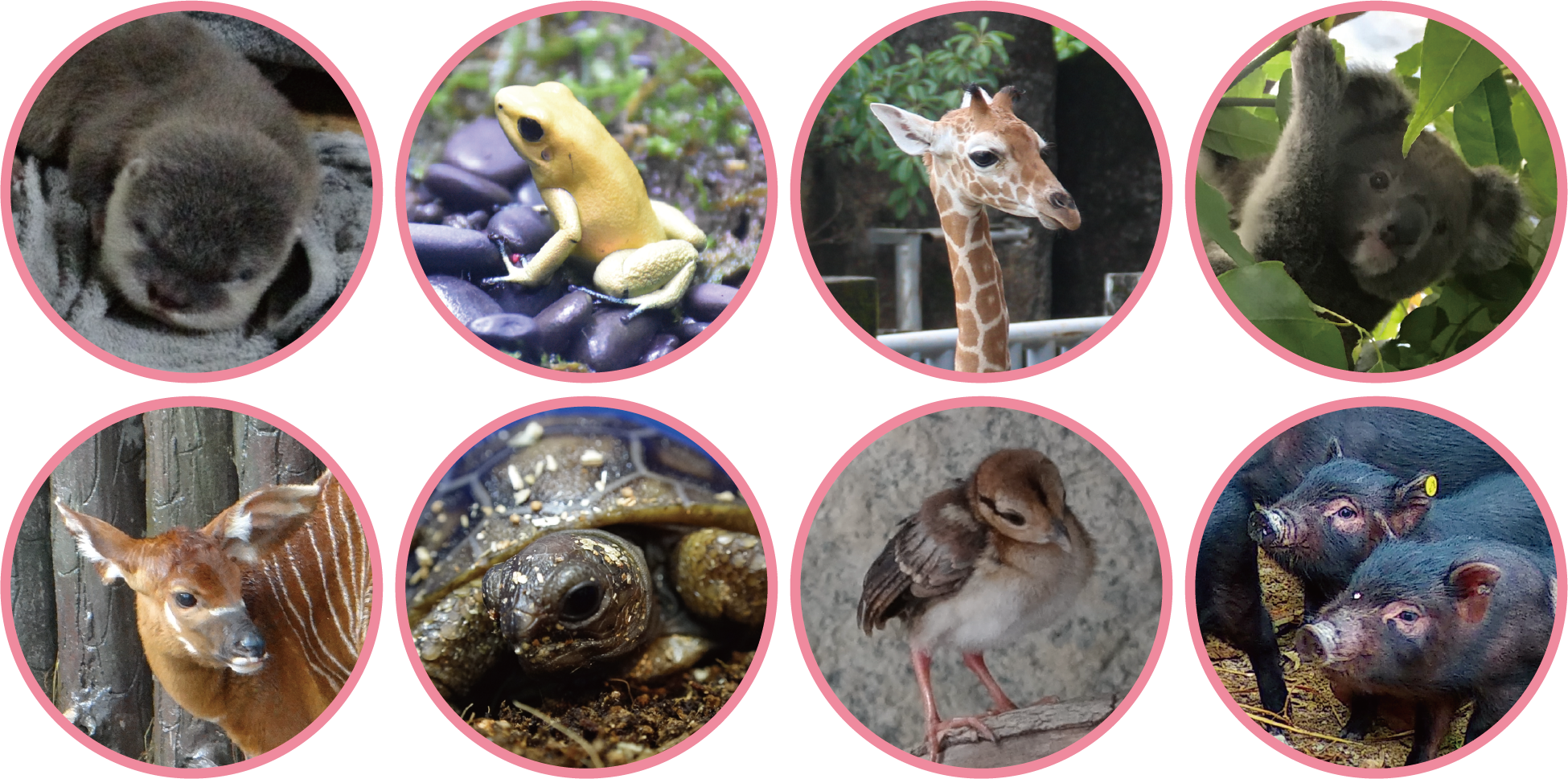 無尾熊、蘭嶼豬、小爪水獺、長頸鹿、斑哥羚羊、箭毒蛙、亞達伯拉象龜、藍腹鷴