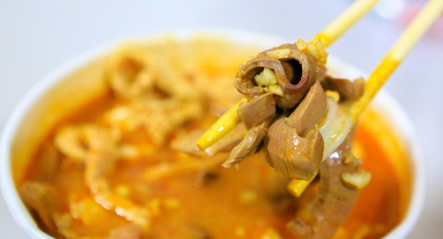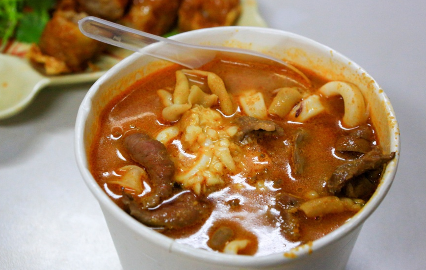 沙茶麵之所以所以所以有濃郁的湯頭,據說是因為採用薑黃,椰仁,花生,辣椒,丁香等三十多種香料繼續調味,也因此湯頭的口感特別複雜與濃稠,至於面裡的配料則有豬肝,肉絲,魷魚,鴨胗,蚵仔,雞心,大腸...。一字排開任君君挑選,一碗入肚,絕對飽足。