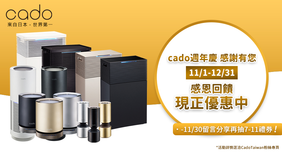 週年慶感恩回饋2選1 買cado空氣清淨機送cado隨身車用型 指定清淨機85折起在送原廠濾芯 -11/30留言分享抽7-11禮券!