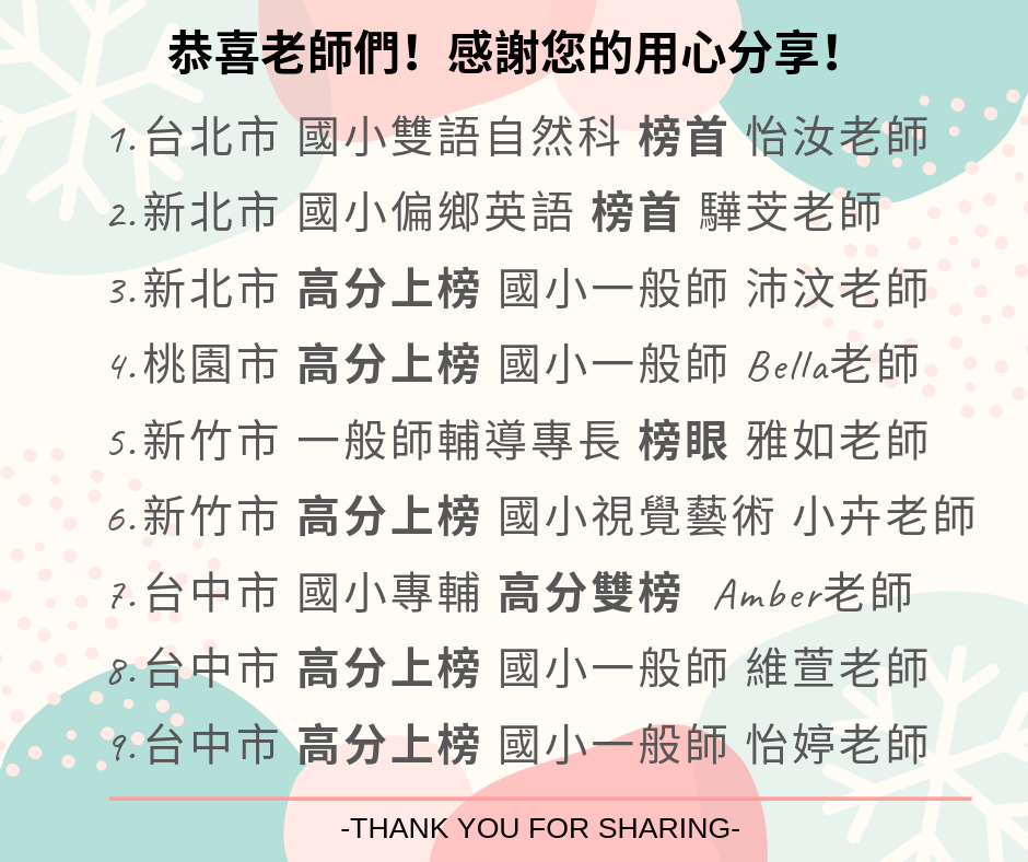 桃園國小一般師 林老師 新竹兼輔教師-小瑀老師 新北國小應屆專輔-楊老師 新北國小特教-鄭老師 新北國小一般轉任專輔-陳老師 新北幼教-如如老師 桃園國小一般師-朱老師 幼教應屆教保員-楊老師 台南應屆一般師-蘇老師 台南國小專輔-黃老師 台北國小專輔-Cathy老師 台北幼教應屆-小羊老師