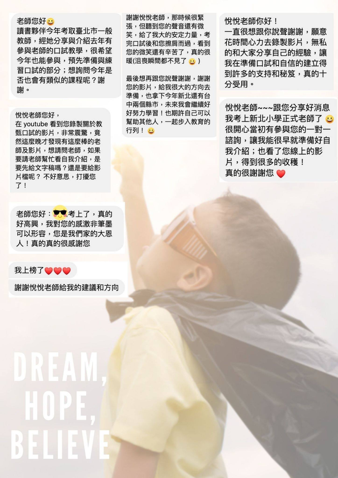 在教育訓練的道路上,我秉持著「人人都做得到」的理念,藉由線上一對一的教學,讓老師們看見自己的獨特,紀錄自己達成的成就,找回對教育的熱忱和初衷!我的服務內容包含一對一的心理諮詢、模擬面試、試教演練、諮商演練、雙語面試、各類型英語課程等,我能依照大家的需求給予客製化的協助!祝福每個人都能看見自己的亮點,在築夢的路上繼續散播愛和希望!