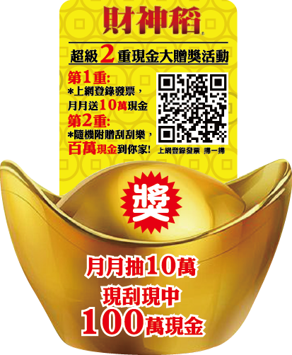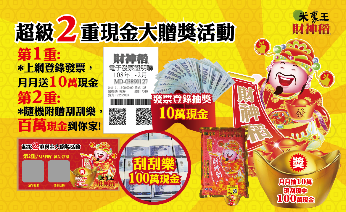 歡迎參加上網登錄發票、月月送10萬現金,越早買、越早抽!凡在全聯福利中心購買米裏王財神稻產品一包,於活動期間登錄發票(上網請掃貼紙QR CODE),就有機會抽中現金10萬元,最好吃的米、給最虔誠的你!
