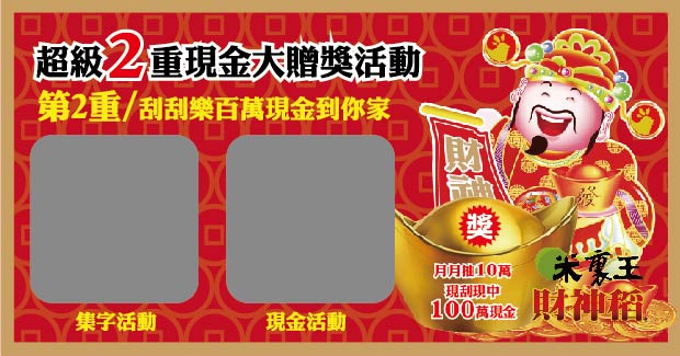 2.集字活動-集滿刮刮樂彩券上5個字"我愛財神稻",可獲贈現金10萬元。