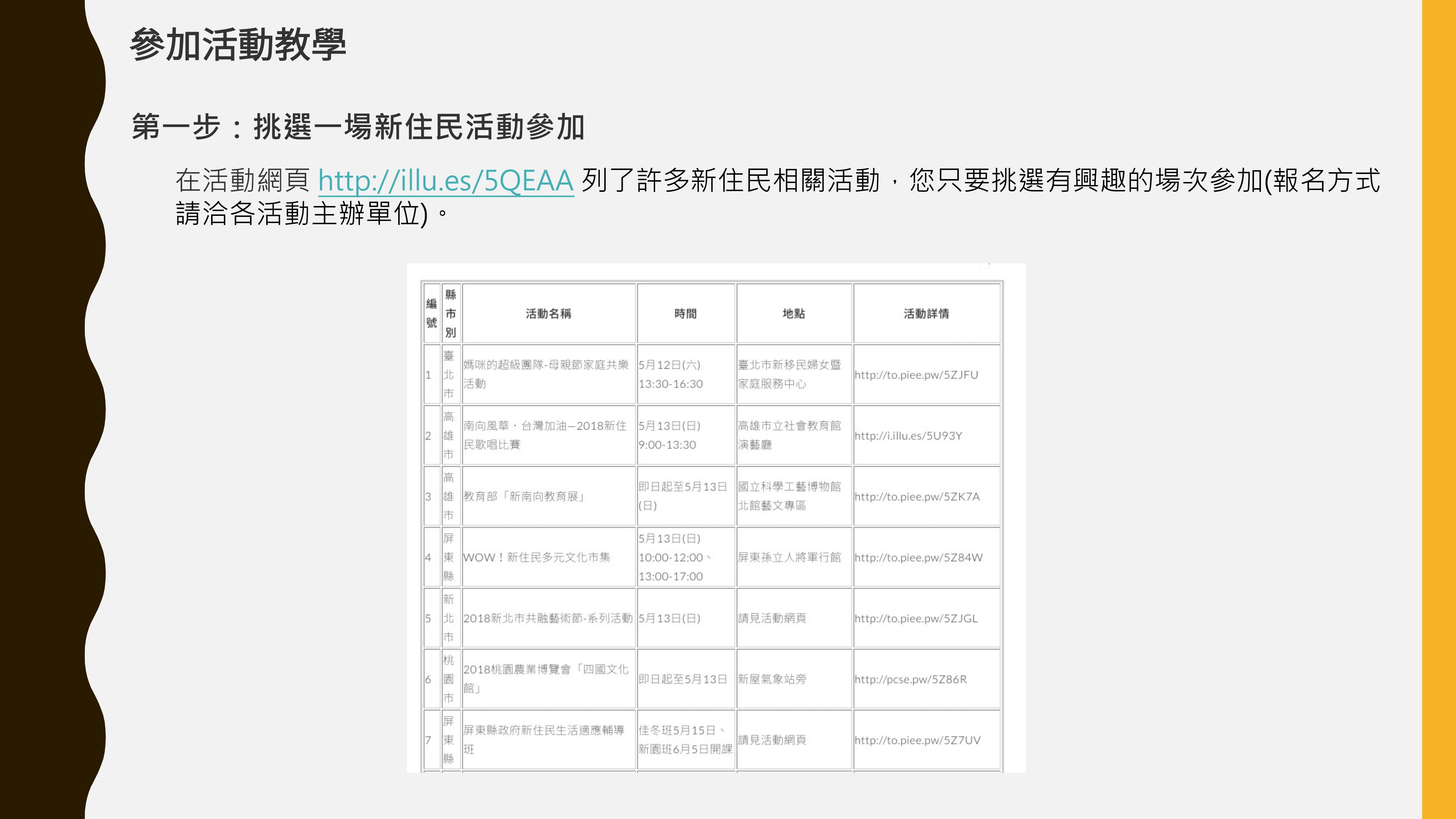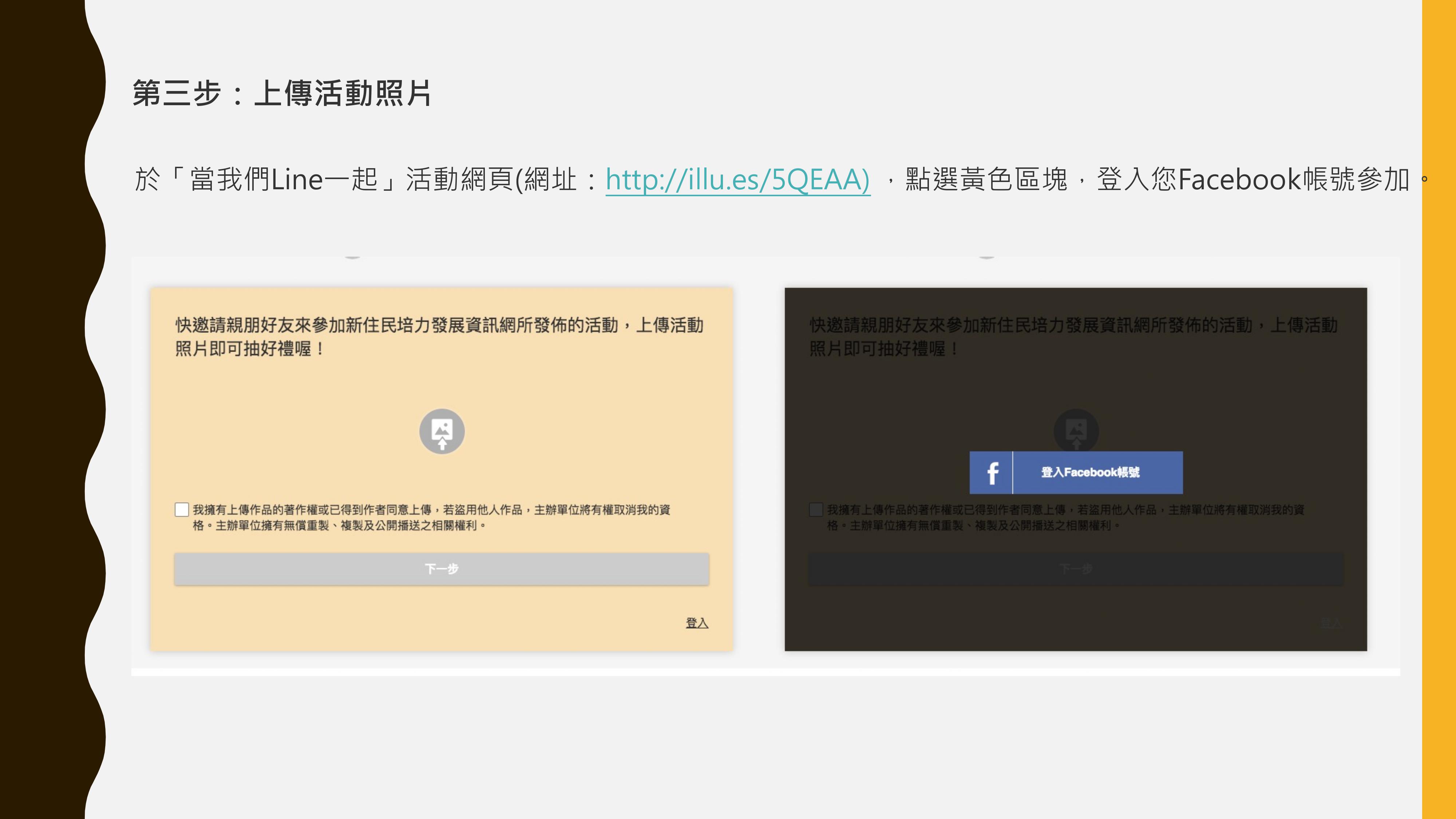 即日起至2018年12月31日,參加新住民培力發展資訊網或Line官方帳號所發佈的活動,於「當我們Line一起」活動網頁(網址:http://illu.es/5QEAA)上傳活動照片即可參加抽獎。