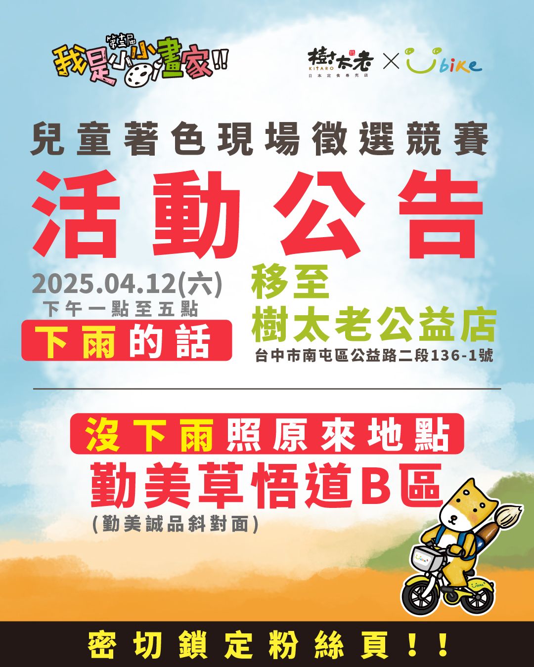 活動期間於樹太老10間門市及YouBike台中服務中心(台中、大甲服務中心)領取著色圖紙(領完為止),或於樹太老官網、Facebook、相關活動網站下載輸出A3大小,使用色筆著色後(不接受電腦繪圖),請以掛號郵寄方式寄至樹太老總公司或將作品繳至樹太老門市代收,主辦單位將於活動結束後公佈得獎名單。