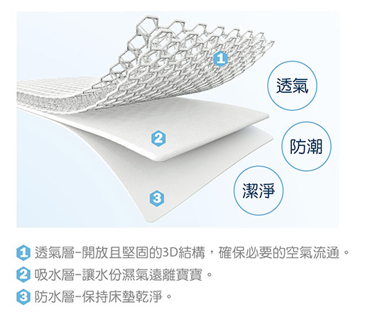 ●融合創新的3D科技和經典的保潔墊設計,來保護寶寶和床墊。