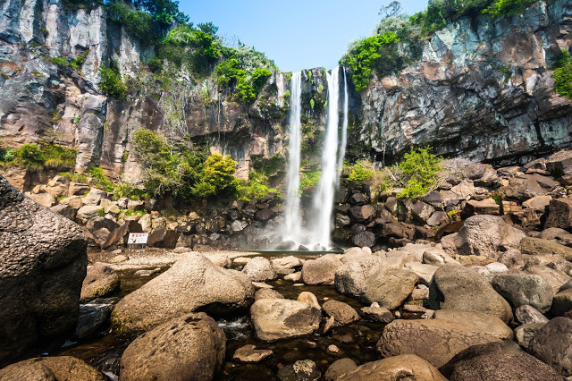 濟州三大瀑布之一,也是亞洲唯一直接入海的瀑布,水勢浩大、水質清透,許多人夏天會在瀑布溪邊戲水,也是拍美照的好地方。