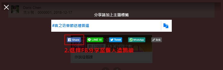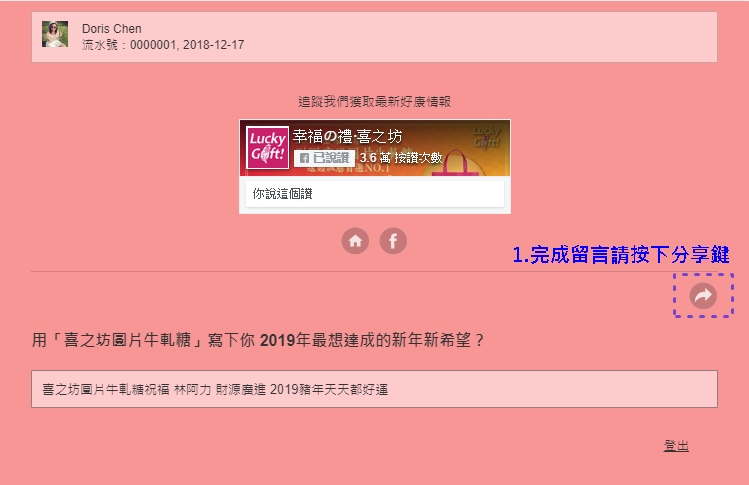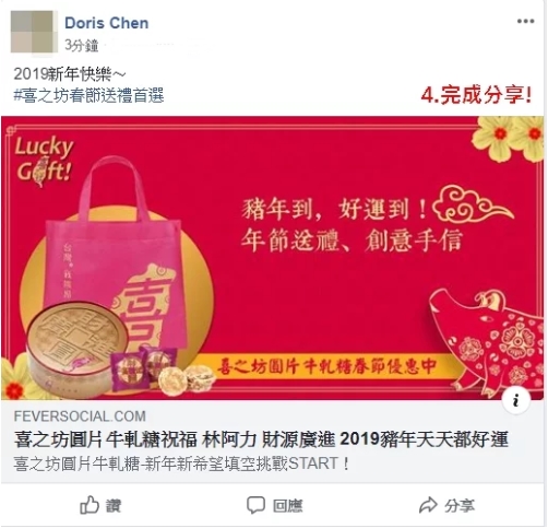 4.完成分享!祝您抽中喜之坊財圓廣進禮盒唷~