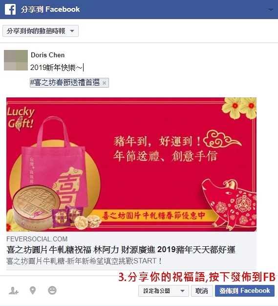 留下你的祝福語分享至FB個人塗鴉牆,就有機會抽中喜之坊伴手禮-財圓廣進圓片牛軋糖禮盒