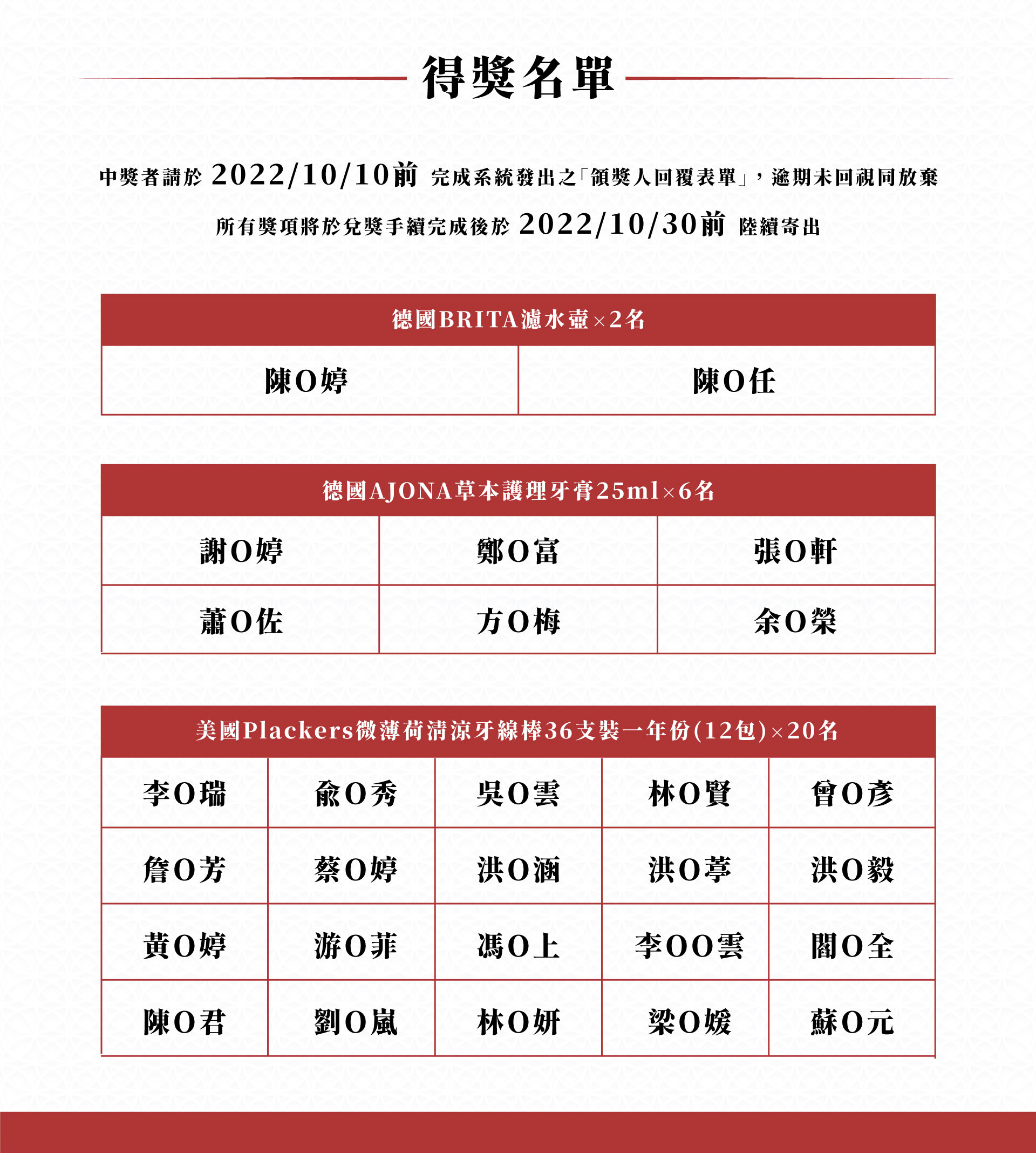 (3).所有獎項將於兌獎手續完成後於2022/10/30前陸續寄出,得獎者亦不得異議。