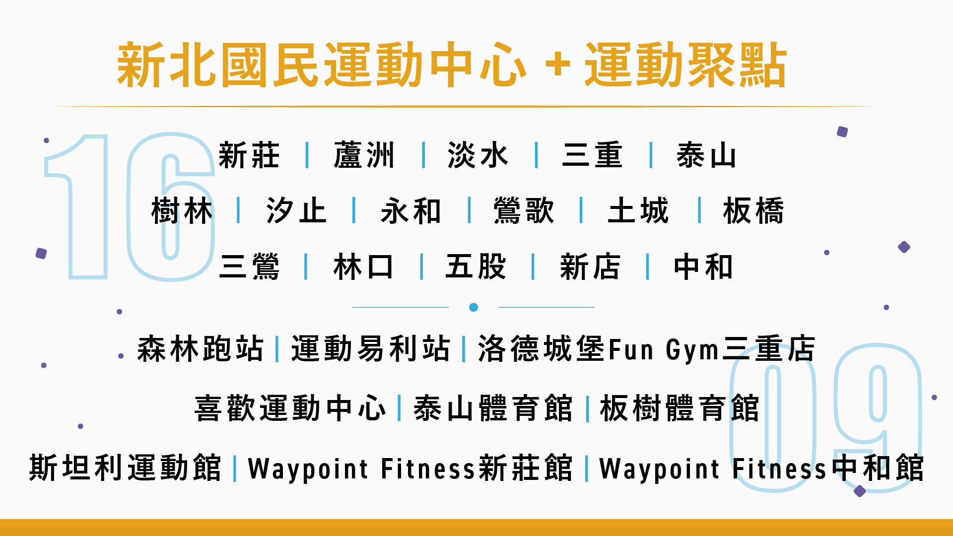 森林跑站(板橋館)、運動易利站(新莊店)、洛德城堡 Fun Gym 三重店、喜歡運動中心、泰山體育館、板樹體育館、斯坦利運動館、Waypoint Fitness 新莊館、Waypoint Fitness 中和館,共9處。