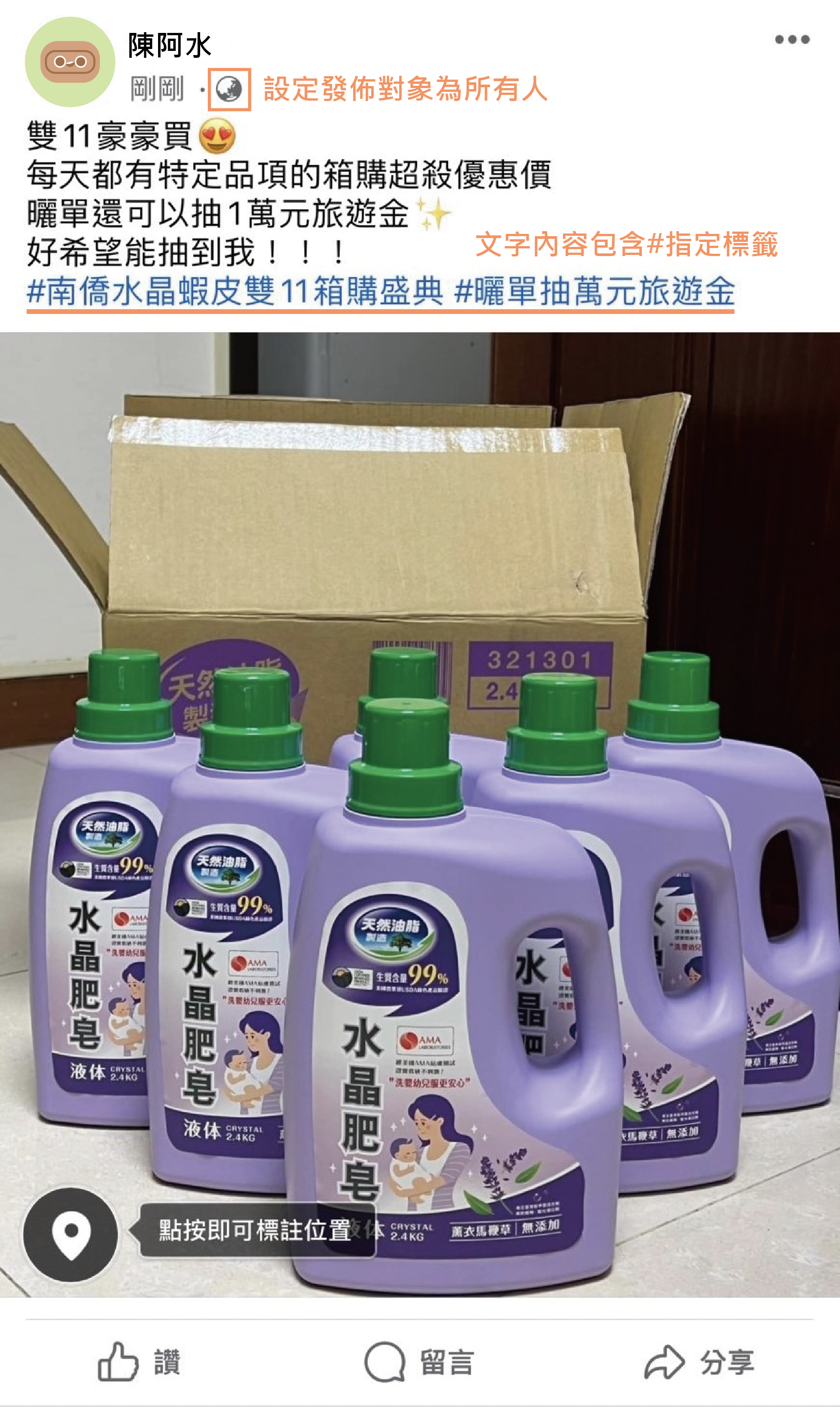 文字:須包含指定標籤 #南僑水晶蝦皮雙11箱購盛典 #曬單抽萬元旅遊金