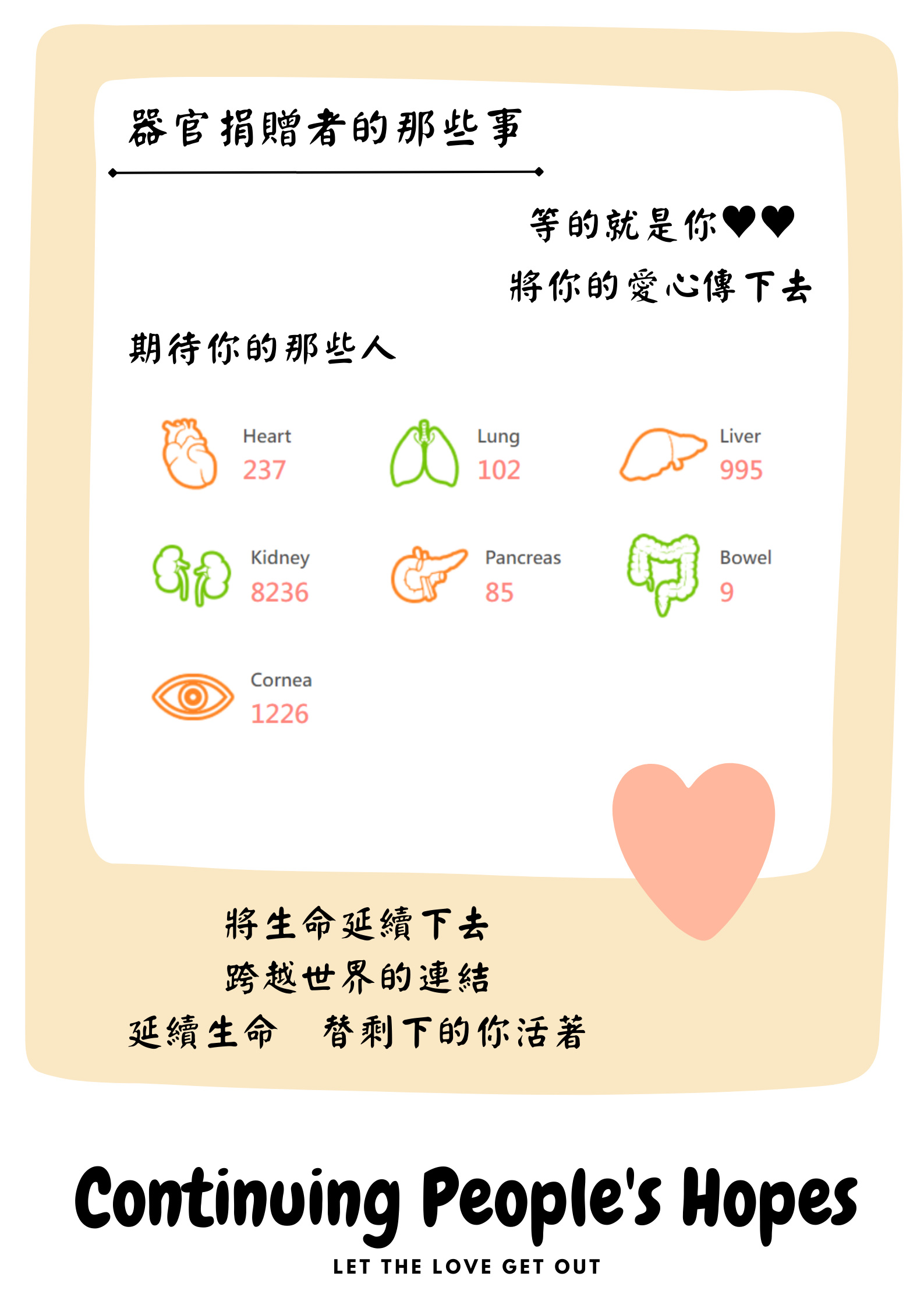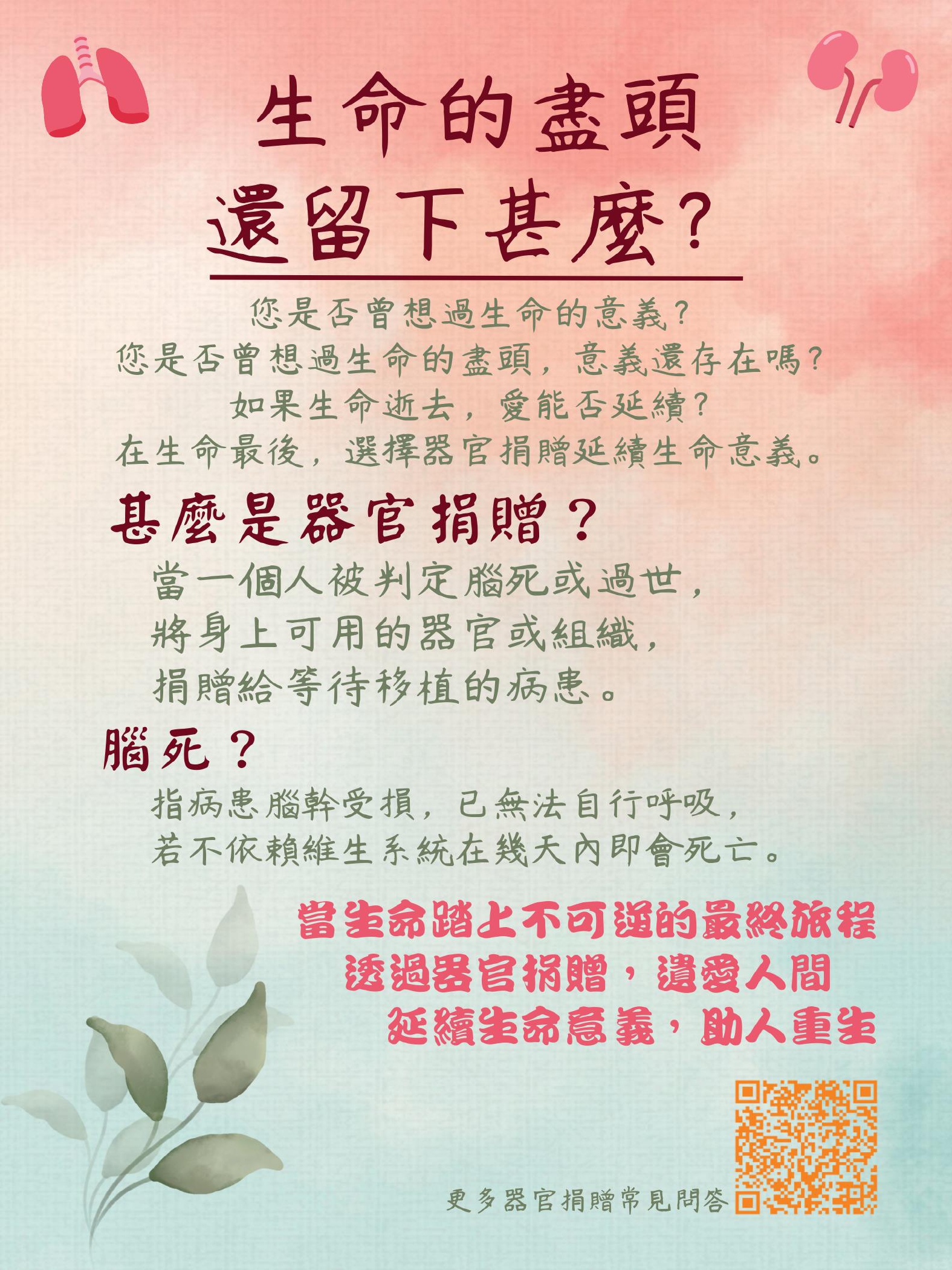 為提升學生對生命教育的認識,長庚大學通識教育開授「利他行為與生死迷思」課程,以教學實作學習方式, 讓學生融會貫通課堂所學知識,設計器官捐贈海報,並藉由評選活動,增進學生了解大學社會責任,促進永續發展(Sustainable Development Goals, SDGs)社會「健康福祉」之目的。