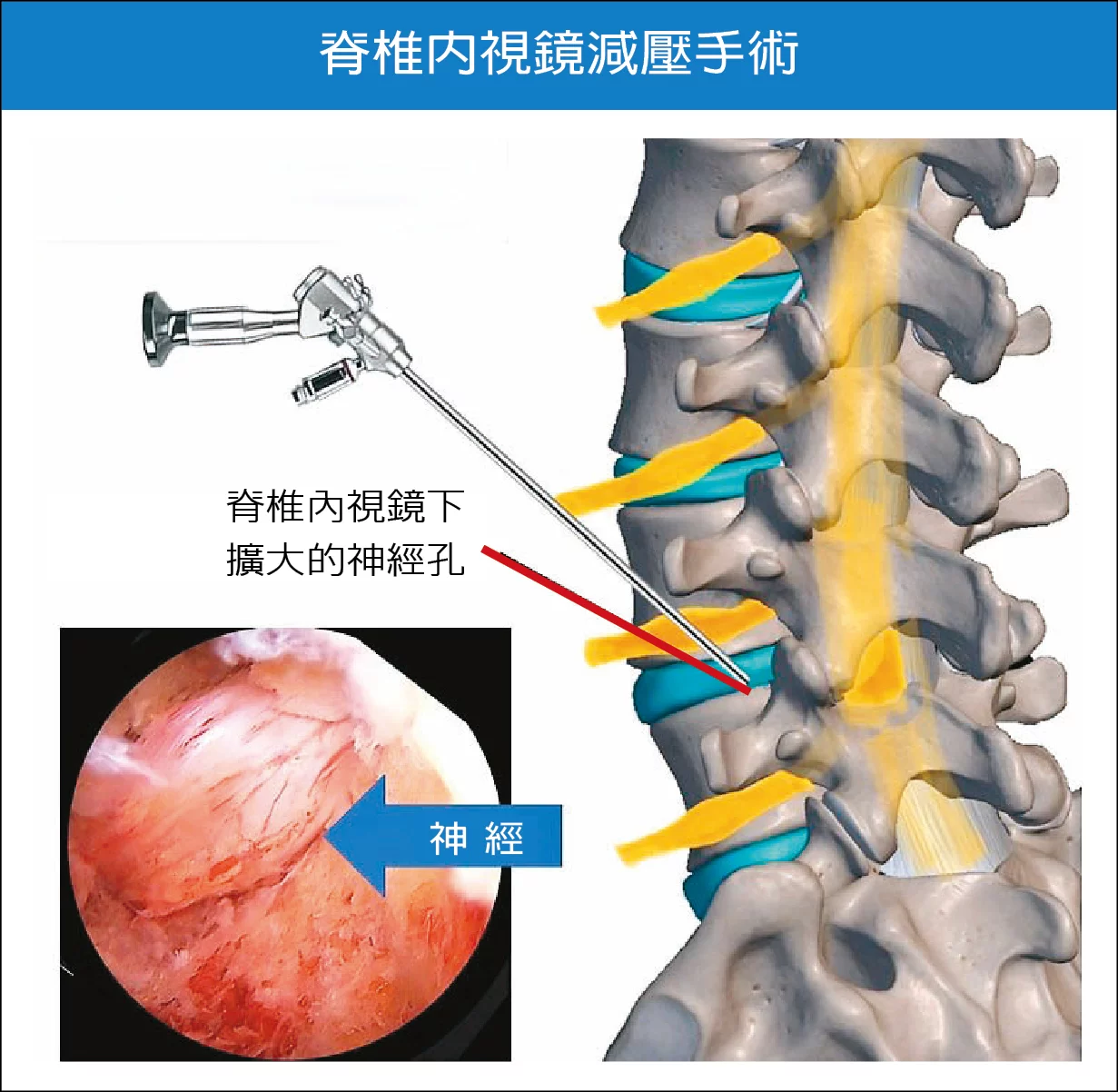 主要運用微創內視鏡減壓術來避免破壞重要結構。手術是在背部開約一公分多的小口,再以光纖內視鏡清楚地掌握壓迫神經的骨刺並加以清除,保留健康的組織,術後傷口小、恢復快,椎管空間在大幅改善後,神經根不再受到壓迫。尤其避免傳統融合手術過度為神經減壓以致破壞脊椎結構,與未來的後遺症。病人在術後第二天即能下床開始復健。