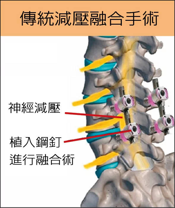 傳統的脊椎手術,主要是將脊椎打開,減輕對神經的壓力,再打開脊椎後,會透過鋼釘進行固定,防止脊椎因鬆散而滑動。