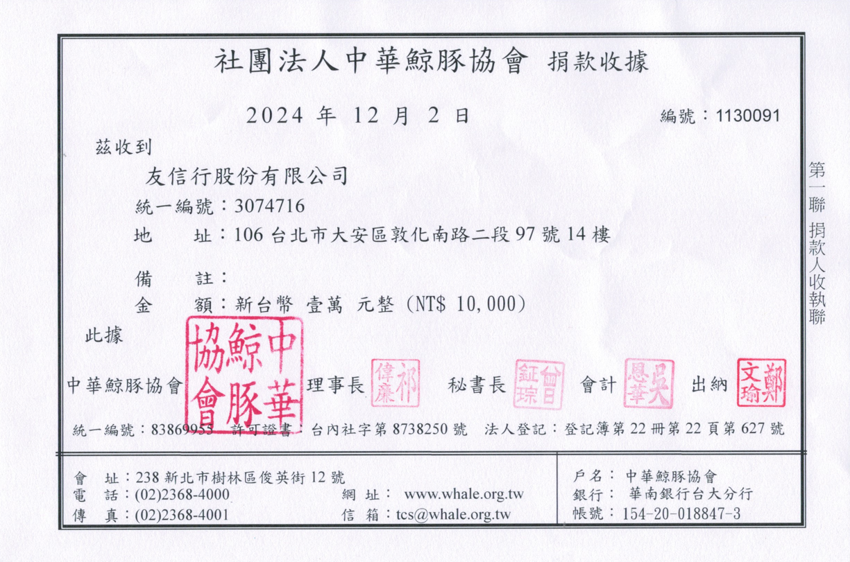 凡活動期間參加留言成功,至活動時間截止(2024/10/31),主辦方最後計算有效留言累積則數,每一則留言捐款10元給「中華鯨豚協會」。