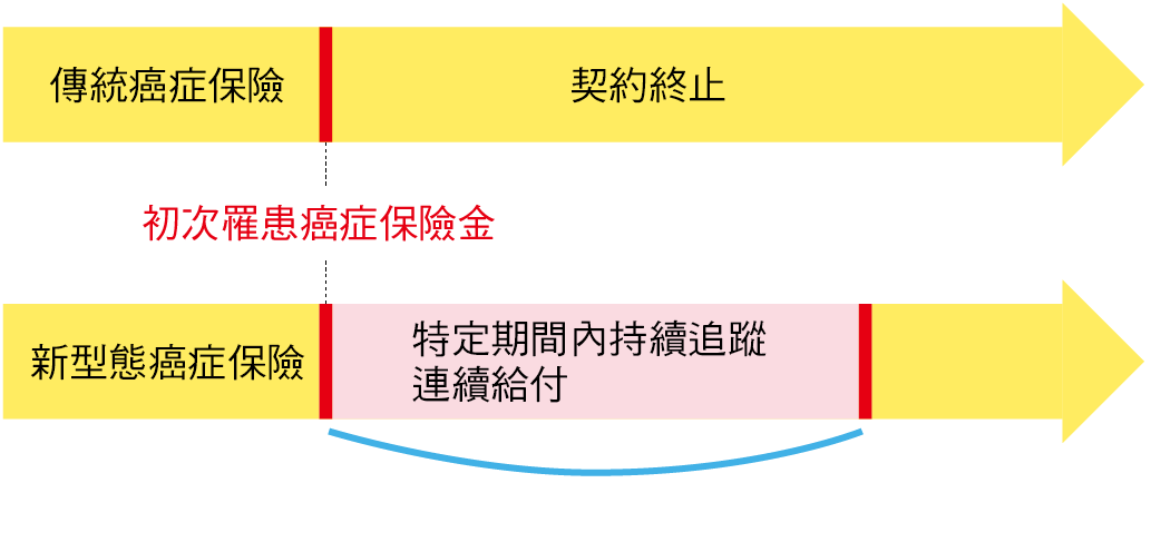 相較於過去確診罹癌一次給付癌症保險金後保單效力即終止的傳統癌症保險,貼心考量癌症狀態持續、復發與罹患其他癌症可能,新型態癌症保險加入連續給付機制:在一次給付癌症保險金後保障不終止,加上豁免保費機制,在保障期間內若保戶可提出癌症狀態持續、癌症復發、轉移或二度罹癌的病理報告,仍可持續請領整筆給付的罹癌保險金作為醫療支持,減輕負擔、安心治療。