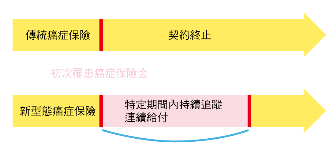 相較於過去確診罹癌一次給付癌症保險金後保單效力即終止的傳統癌症保險,貼心考量癌症狀態持續、復發與罹患其他癌症可能,新型態癌症保險加入連續給付機制:在一次給付癌症保險金後保障不終止,加上豁免保費機制,在保障期間內若保戶可提出癌症狀態持續、癌症復發、轉移或二度罹癌的病理報告,仍可持續請領整筆給付的罹癌保險金作為醫療支持,減輕負擔、安心治療。
