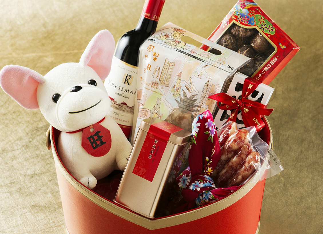 多款應景伴手禮,包含各式中式小點及年節必備伴手禮外,更推出「旺事如意」、「十犬十美」兩款精緻禮籃,不僅內含華美豐盛的年節選物,以皮革打造的質感包裝,讓您盡表心意不忘面增光!