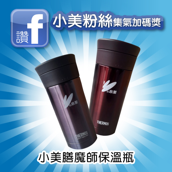 回饋既有小美粉絲,活動參加人數每滿500人,會從參加者中具有小美FB粉絲身份者,增額加抽1名抽獎名額贈送「 小美膳魔師保溫瓶350ml」1瓶。滿1000人參加-加抽第2名、滿1500人參加-加抽第3名…...持續增加參加人數皆以類推(每增加500人就再加抽一名,抽至10人為限) 揪團集氣參加,機會多更多! |