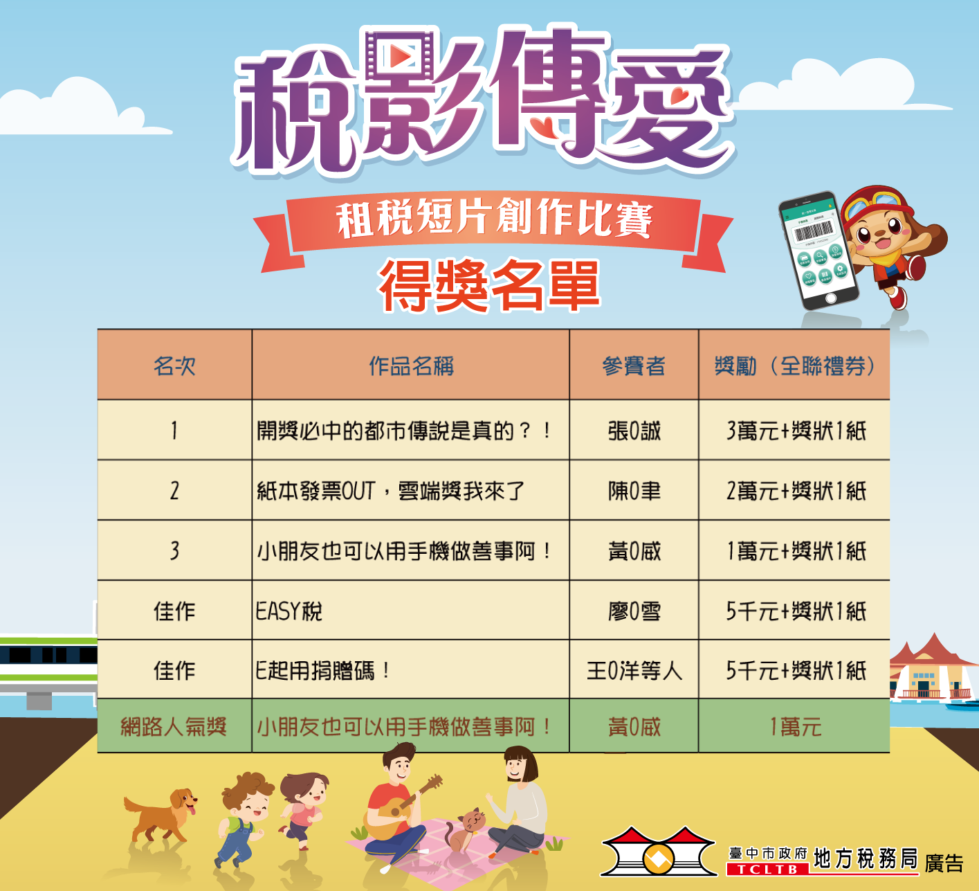 (二)短片中須穿插「雲端發票四部曲」、「利用電子支付帳戶/行動支付繳稅」、「使用捐贈碼捐贈雲端發票給社福團體」相關內容或 其他與「地方稅-使用牌照稅、房屋稅、地價稅、土地增值稅、契稅、印花稅及娛樂稅」等相關之主題。
