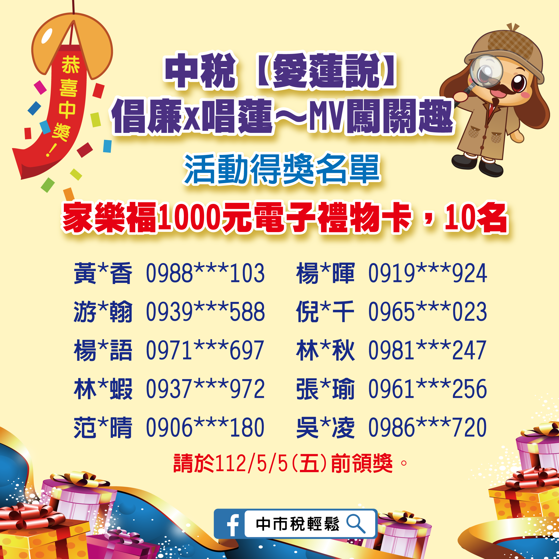 112/4/21前於本局網站、活動網頁及中市稅輕鬆FB粉絲專頁公布得獎名單。