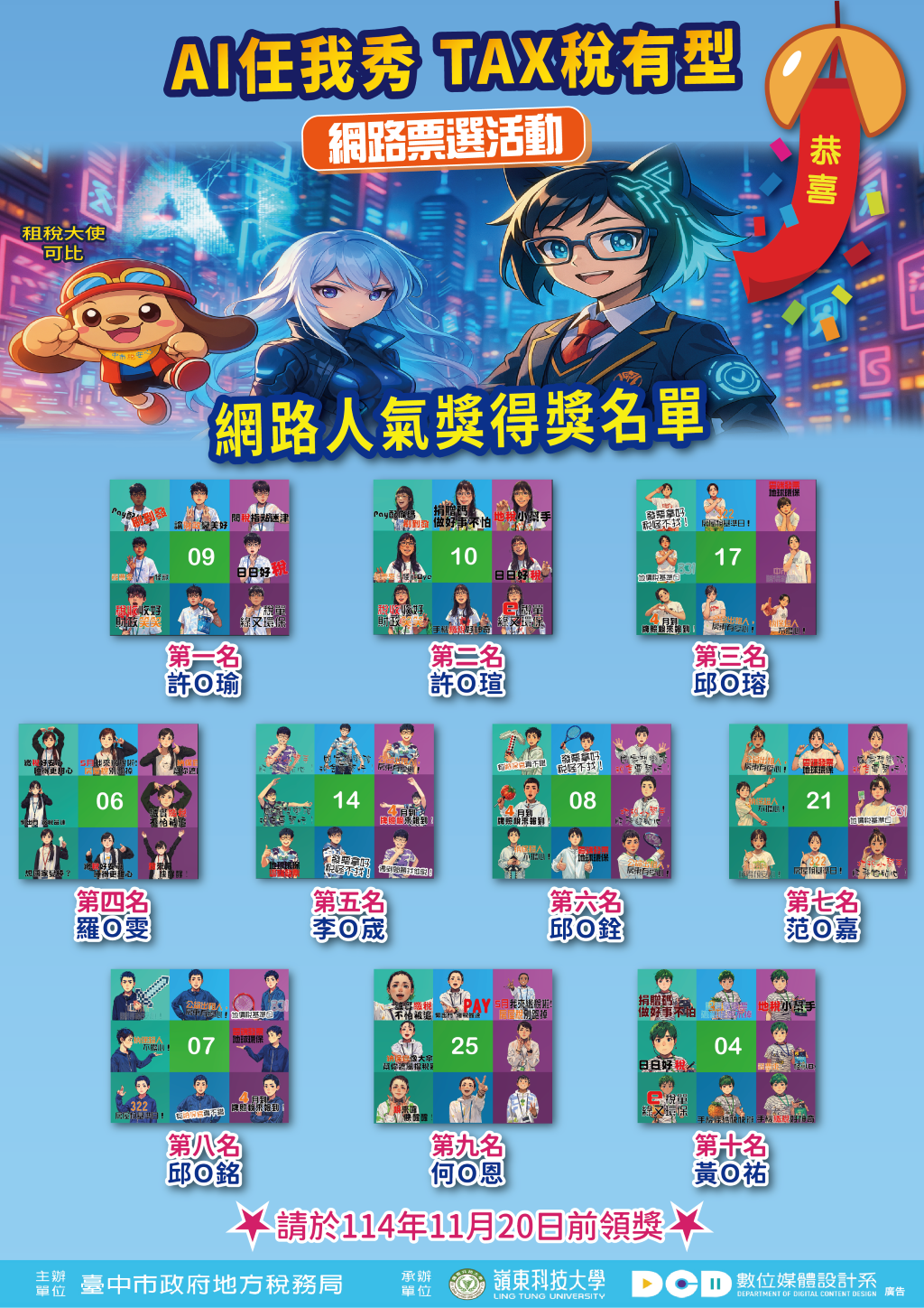 四、得獎公布:114年11月4日前於本局網站、活動網頁、中市稅輕鬆FB粉絲專頁公布得獎名單。