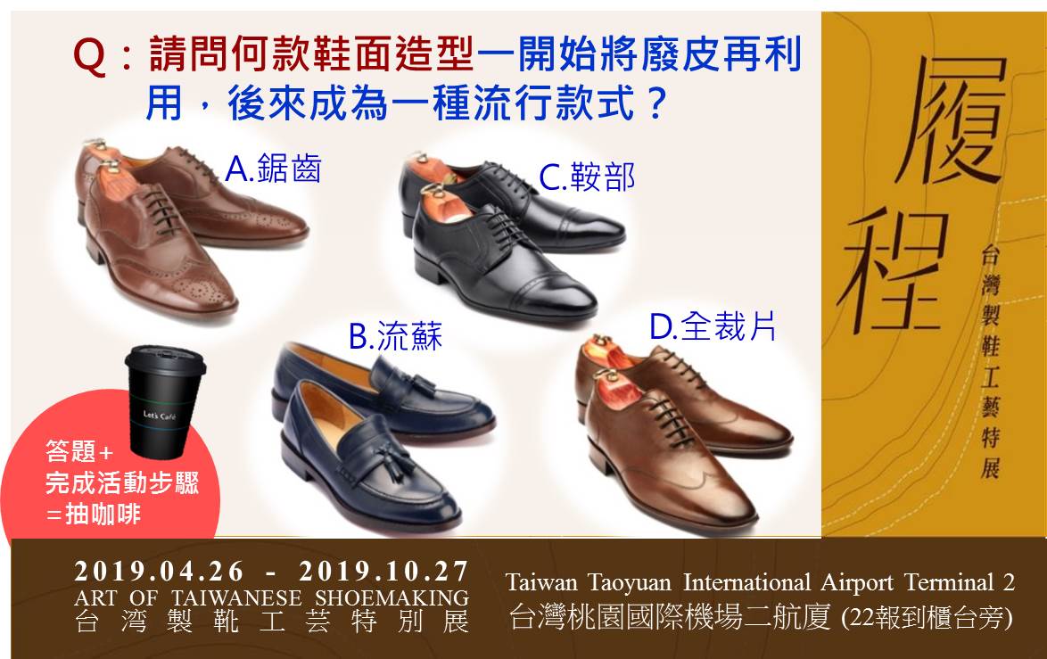 1.本活動網站回答『請問何款鞋面造型一開始將廢皮再利用,後來成為一種流行款式』。