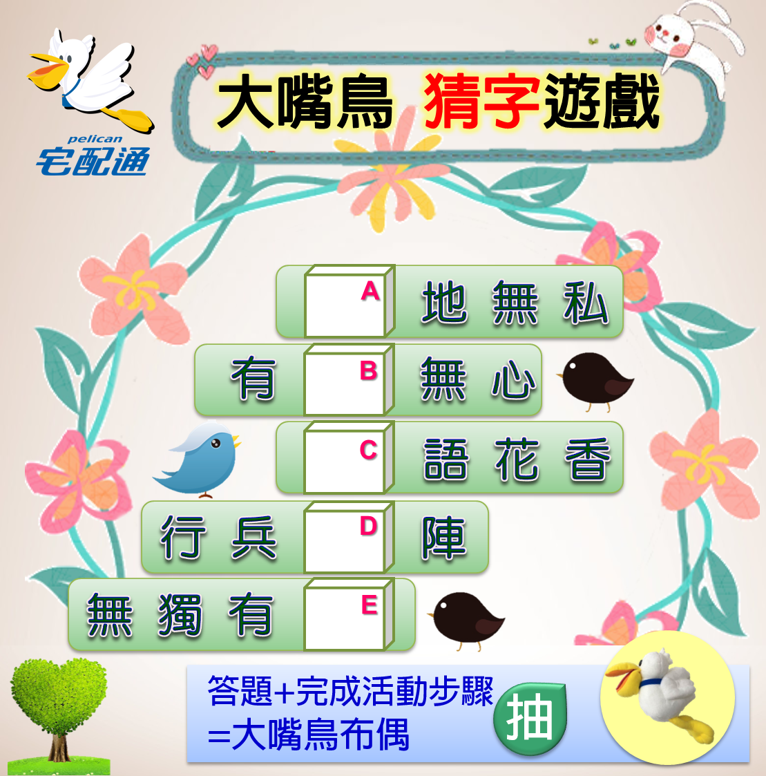 完成以上活動步驟,將抽出3位幸運兒,有機會抽「宅配通大嘴鳥布偶」。