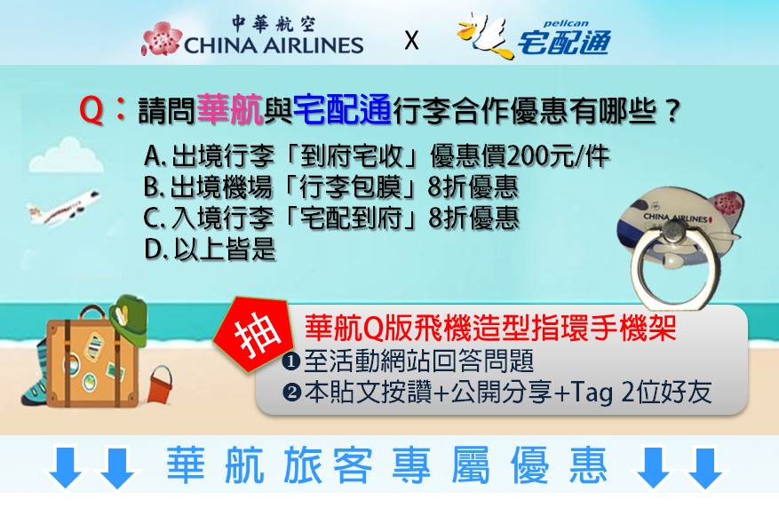 宅配通為提供旅客舒適便捷的行李配送服務,與華航攜手合作優惠好康,讓旅客輕鬆出國及返家!