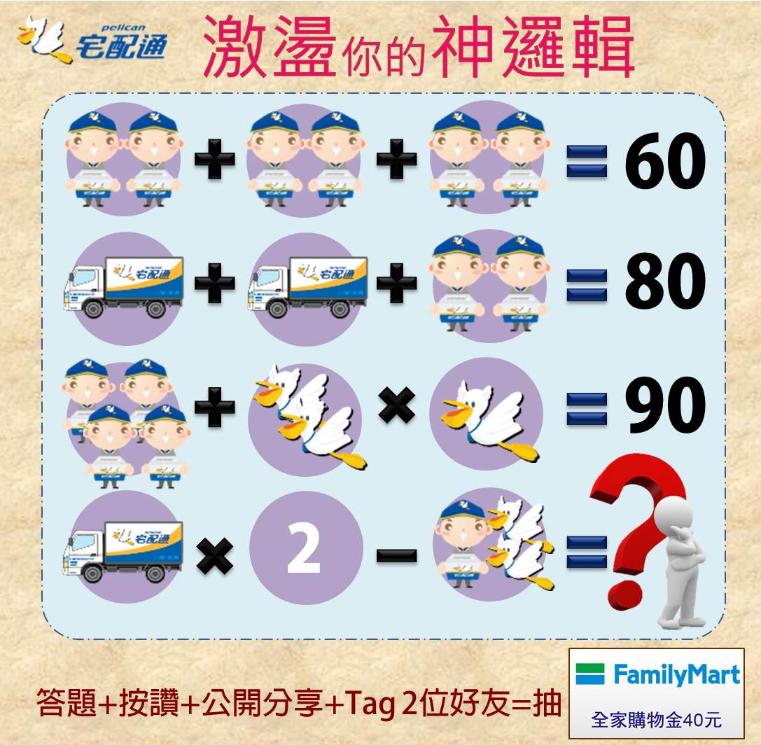 1.未至本活動網站回答者及答案不正確者、尚未於宅配通粉絲團貼文按讚及公開分享者,皆喪失抽獎資格。需全數符合者,方有獲獎之資格。