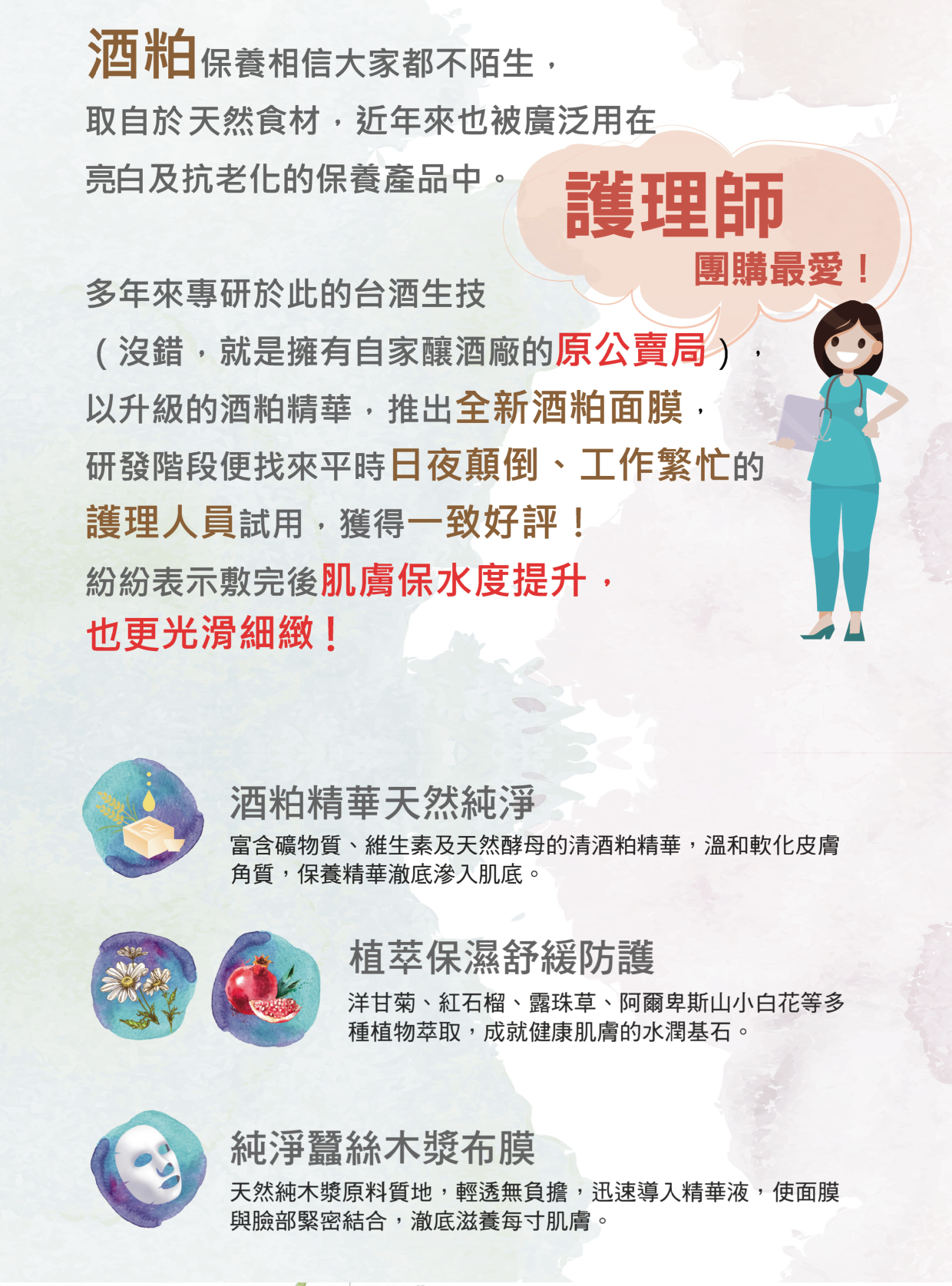 1.酒粕精華天然純淨:富含礦物質、維生素及天然酵母的清酒粕精華,溫和軟化皮膚角 質,保養精華澈底滲入肌底